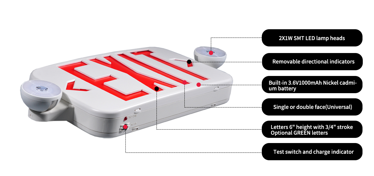 Una combinazione di segno di uscita e emergenza efficiente e sicura. Risparmia denaro acquistando questo prodotto 2 in 1. Batteria Ni-CAD a bassa manutenzione di lunga durata. Lavora su 120 - 277 VAC Universal Tensione. Faceplate include frecce a sinistra/destra knock-out. Il dispositivo è 1 o 2 lati. Il prodotto è elencato UL e soddisfa i codici di emergenza NFPA 101, OSHA e UL 924. Come illuminazione domestica, commerciale e industriale, perfetta per corridoio, corridoio, ospedale, appartamenti, chiese, centri commerciali, supermercati, scuole, hotel, pub, ristorante, magazzini, edificio per uffici, ecc.