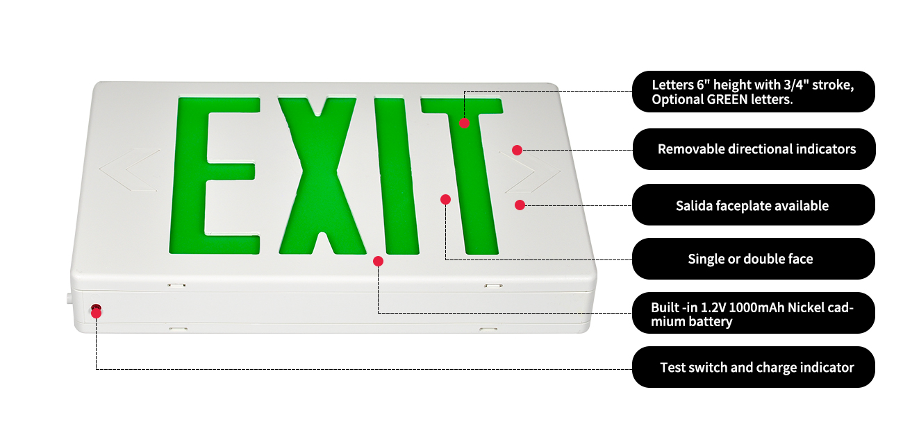 *Costruzione - Il segno di uscita a LED è costruito da un ritardo a fiamma V -0, V -0, alloggi termoplastici ad alto impatto. La casa bianca è standard.